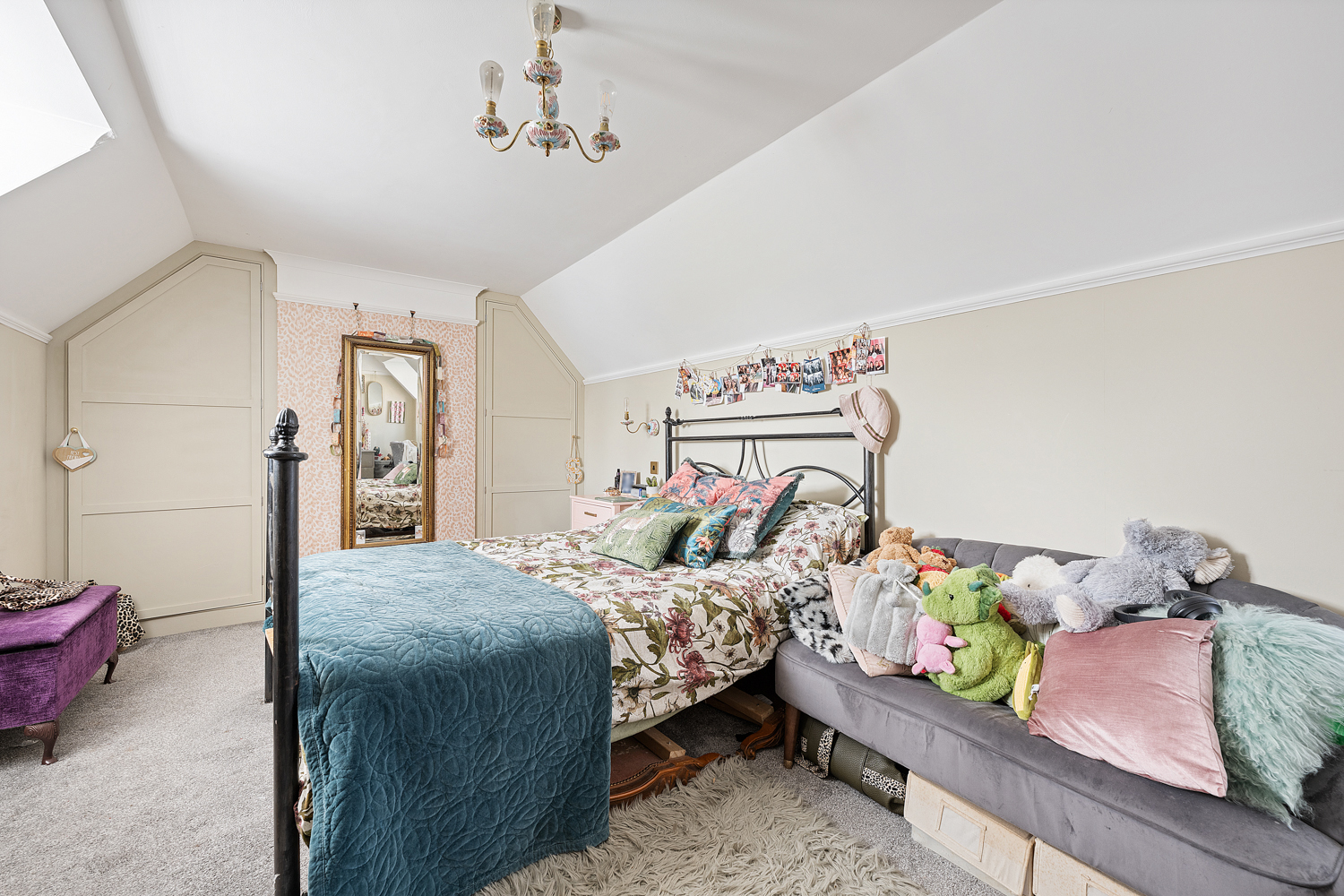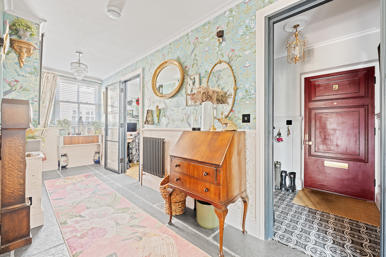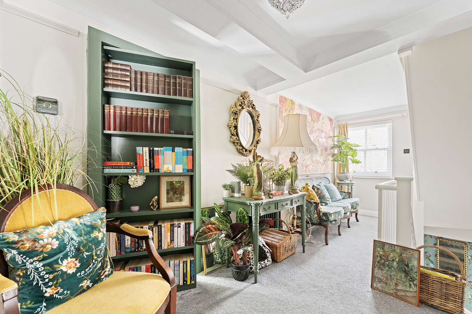 On the first floor, a cleverly concealed living room hidden behind a stylish bookshelf offers a unique and private retreat, complete with a balcony overlooking the garden. This floor also hosts a single bedroom with its own en-suite-ideal for guests-as well as the impressive principal suite, featuring a luxurious en-suite bathroom with freestanding bath, separate walk-in shower, and a spacious walk-in wardrobe.