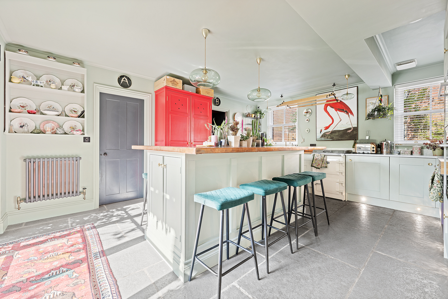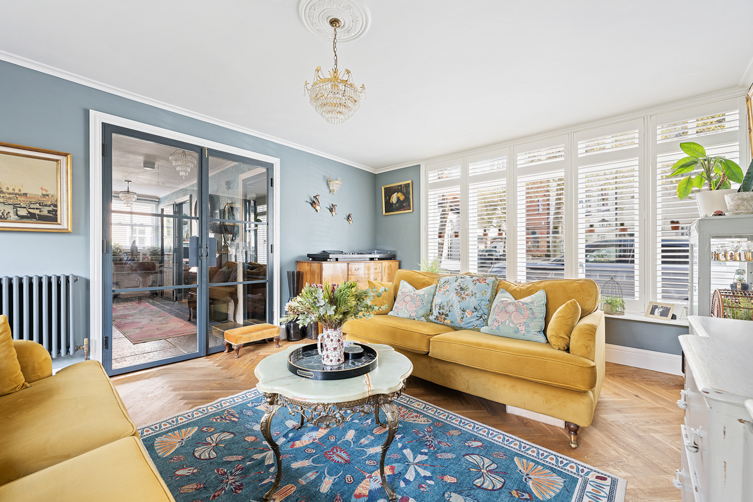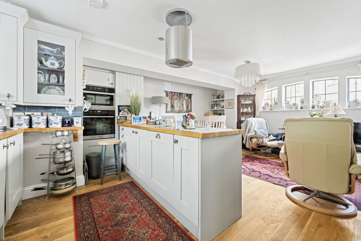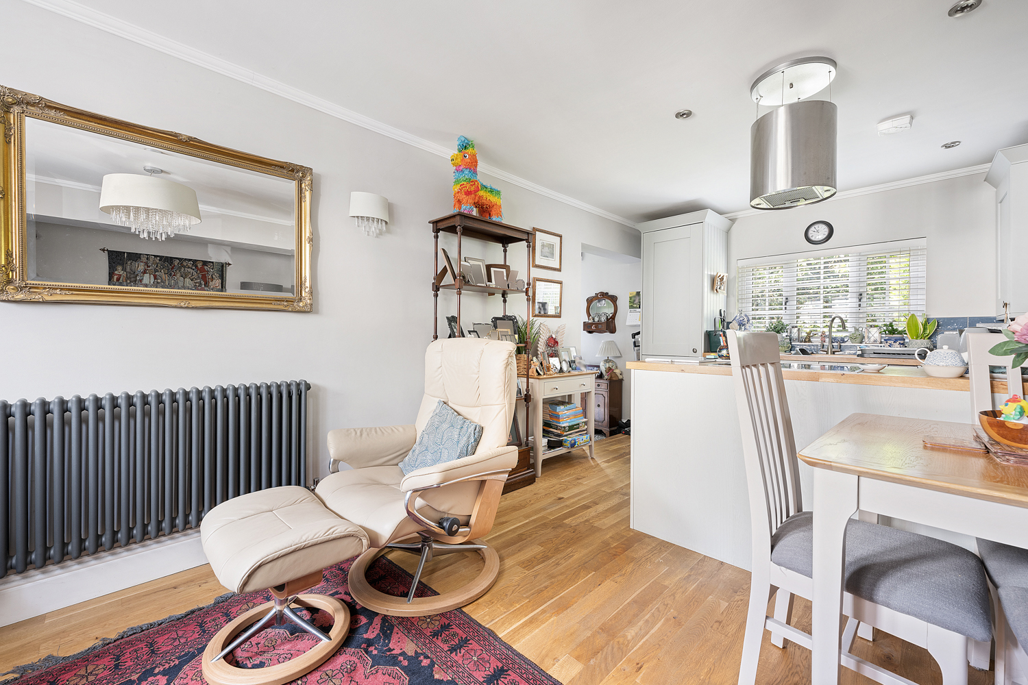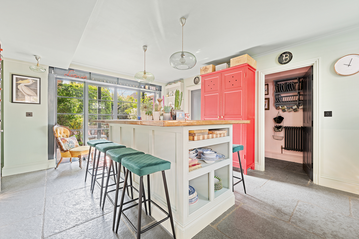 The main house opens into a welcoming entrance hall with a convenient ground floor W/C and a well-appointed study. Striking Crittall-style double doors lead through to an elegant living room, which in turn provides access to an enclosed courtyard garden. To the rear, the property truly comes into its own with a bespoke kitchen and dining area, complemented by separate pantry and utility spaces, all finished with meticulous attention to detail.