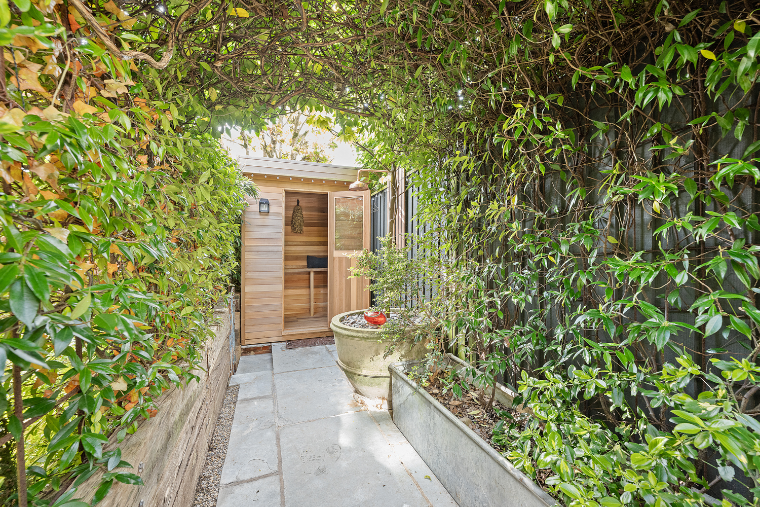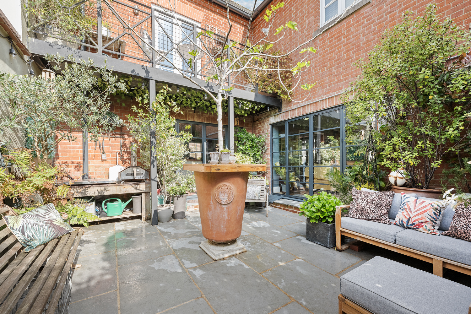 Externally, the landscaped courtyard garden has been designed for both relaxation and entertaining, offering multiple seating and planting areas alongside a recently added sauna, pizza oven, and built-in BBQ.